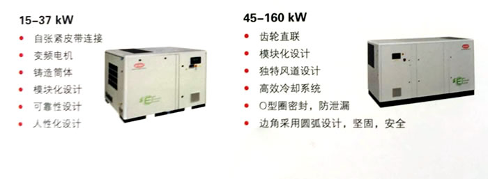 - 15-37kw机组采用铸造筒体,管路集成,不易泄露。45-160kw机组集成了管道和传感器,比其他同类产品减少15%的连接点,大大降低了故障点
