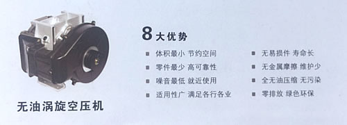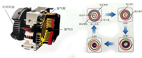 - 空气从主机的外侧面进入,空气被吸入后动涡盘将进气口封闭。随着动涡盘的旋转,空气被不断的压缩,而被压缩后的无油空气从静涡盘点中心处排除